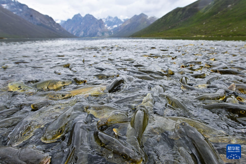 6月11日,在青海省果洛藏族自治州久治县境内的年保玉则,裸鲤在水中活动。新华社记者 张龙 摄