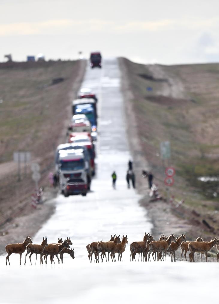 7月28日,一群藏羚羊通过青藏公路前往三江源地区的栖息地。新华社记者张宏祥 摄