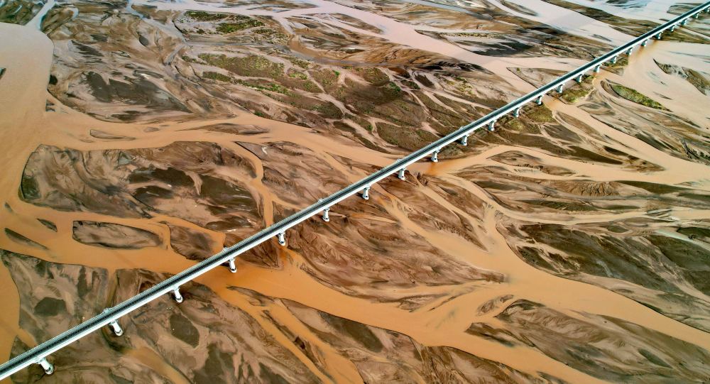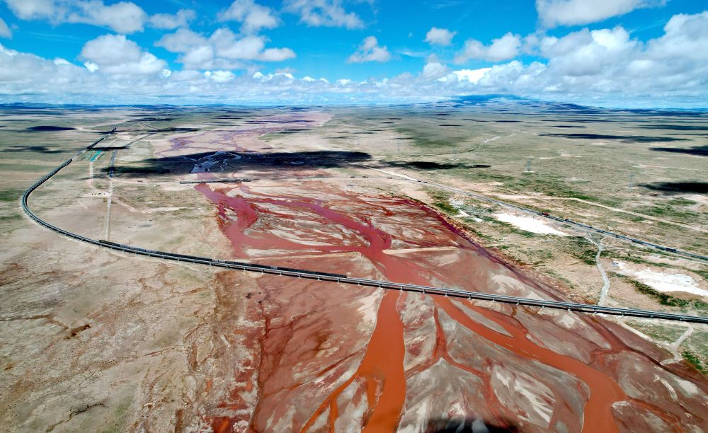 青藏铁路通过辫状河道的沱沱河(7月26日摄,无人机照片)。新华社记者 刘诗平 摄