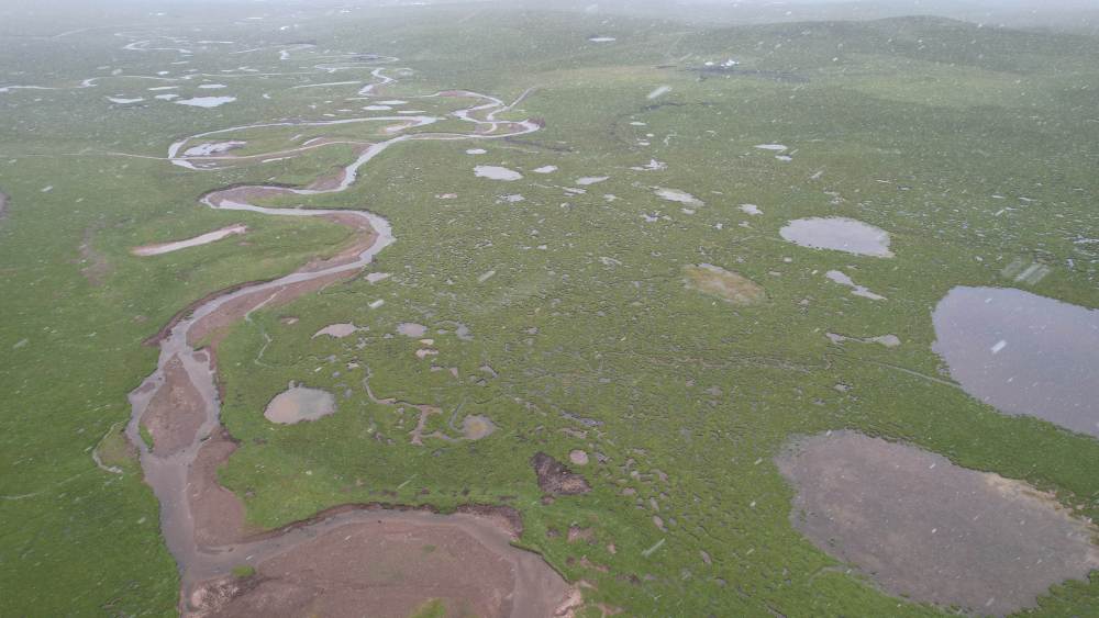 风雪弥漫中的当曲湿地(7月24日摄,无人机照片)。新华社记者 刘诗平 摄