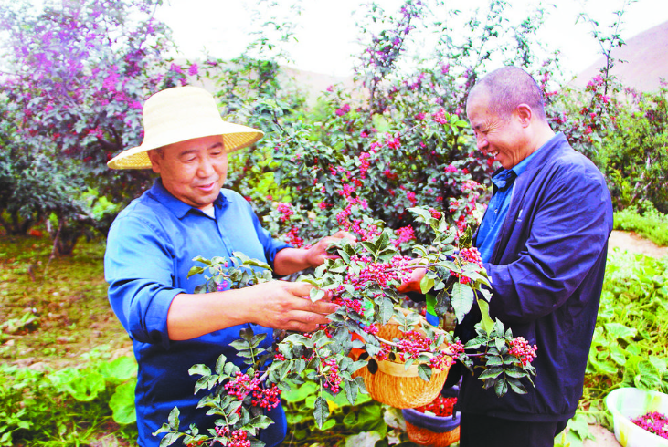 初秋时节,具有“高原小江南”之称的海东市循化撒拉族自治县的花椒迎来了采摘期,红灿灿的花椒挂满枝头,椒农不误农时抢收抢晒,黄河岸边处处呈现出“椒”响曲。图为积石镇河北村的群众在连片花椒种植基地采摘花椒。记者 陈俊 通讯员 循组 摄