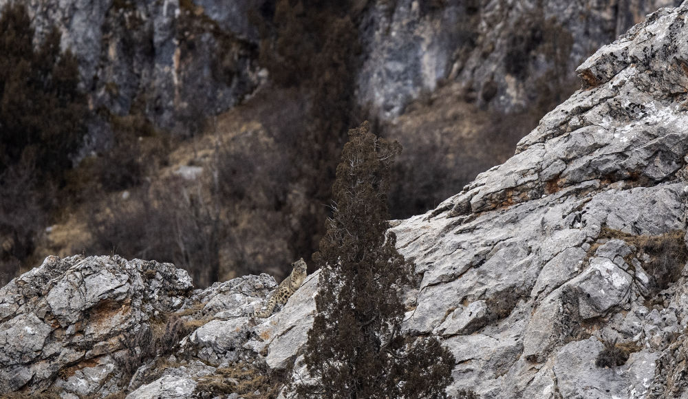 在青海省玉树藏族自治州杂多县昂赛乡境内的昂赛大峡谷内,一只雪豹在岩石上休息(2月21日摄)。新华社记者 张宏祥 摄