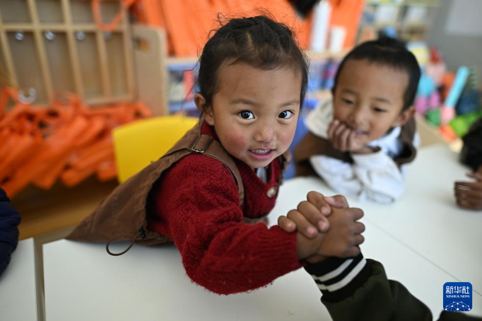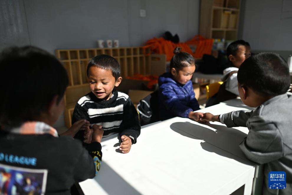 在青海省玉树藏族自治州曲麻莱县秋智乡布甫村阳光幼儿园,丁增巴桑(左)和伙伴们在教室内玩耍(9月14日摄)。新华社记者 张宏祥 摄