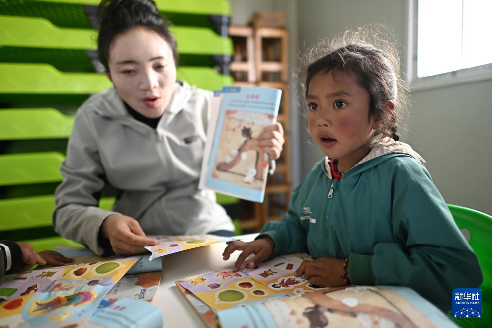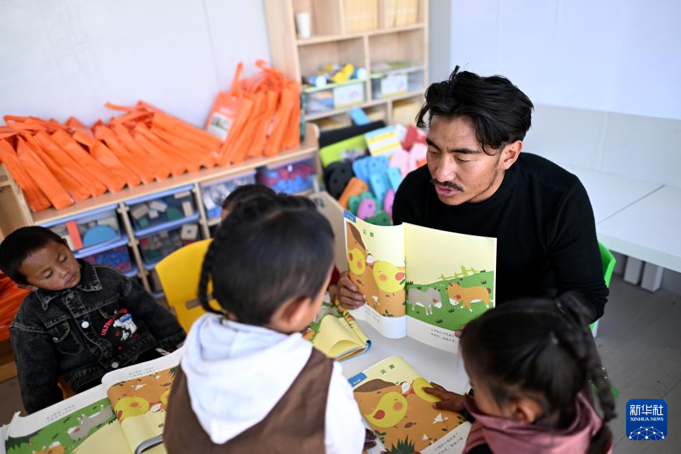 在青海省玉树藏族自治州曲麻莱县秋智乡布甫村阳光幼儿园,秋智乡幼儿园副园长才仁战斗(右二)在课堂上和小朋友互动(9月14日摄)。新华社记者 张宏祥 摄