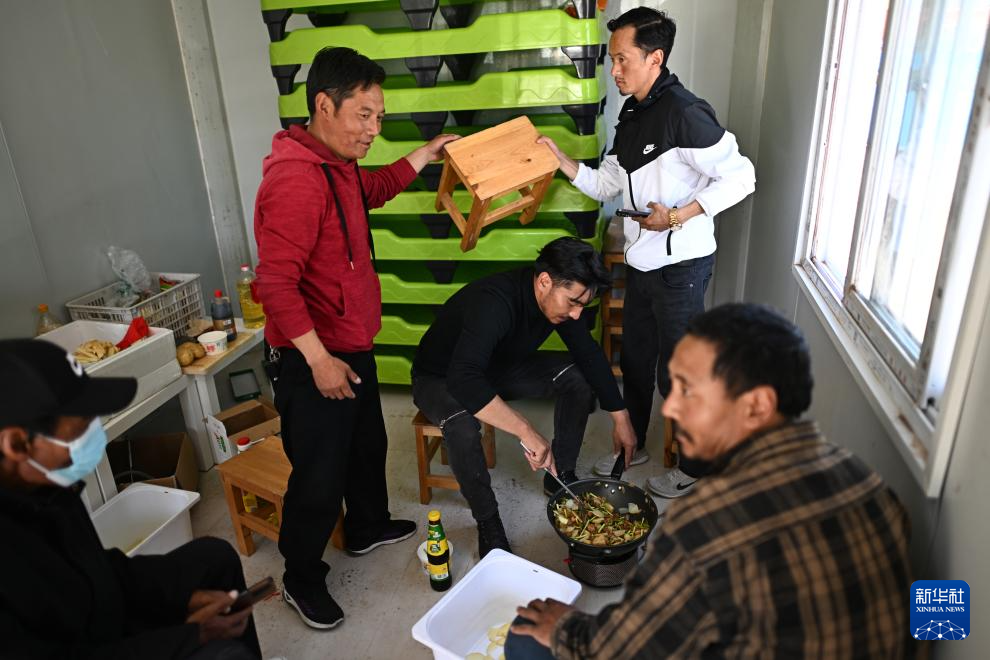 在青海省玉树藏族自治州曲麻莱县秋智乡布甫村阳光幼儿园,秋智乡幼儿园副园长才仁战斗(左三)在板房内为孩子们准备午餐(9月14日摄)。新华社记者 张宏祥 摄
