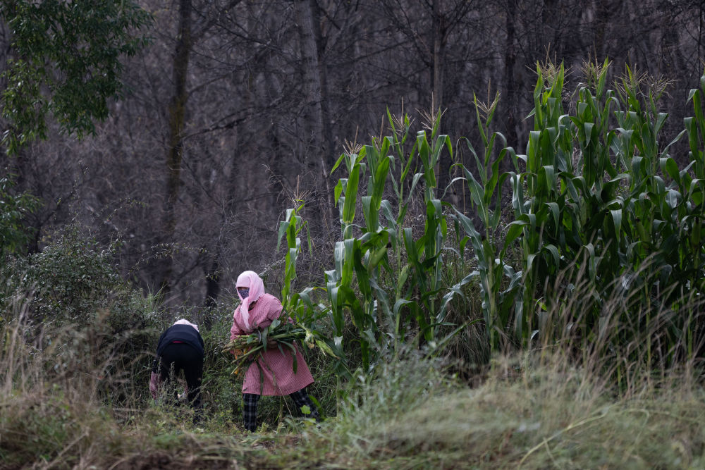 10月8日,在青海省海南藏族自治州贵德县河东乡王屯村,村民们在忙着收割玉米。新华社记者张龙 摄