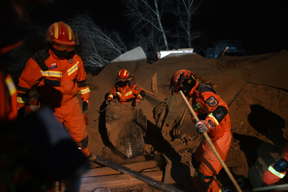 12月19日凌晨,在青海省海东市民和回族土族自治县中川乡草滩村,海东市消防救援支队队员在搜救。