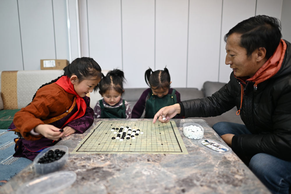 青海玉树曲麻莱县第二民族完全小学学生达沙旦增德金(左一)在家中和爸爸一起下五子棋(1月12日摄)。新华社记者 张宏祥 摄
