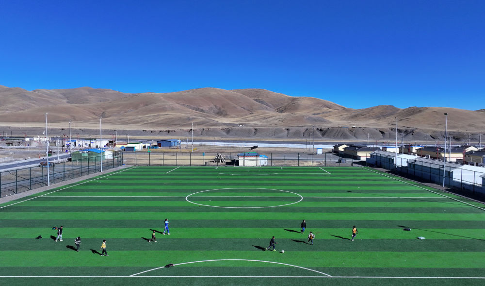 1月12日,孩子们在青海玉树曲麻莱县叶格乡足球场上踢球(无人机照片)。新华社记者 韩方方 摄