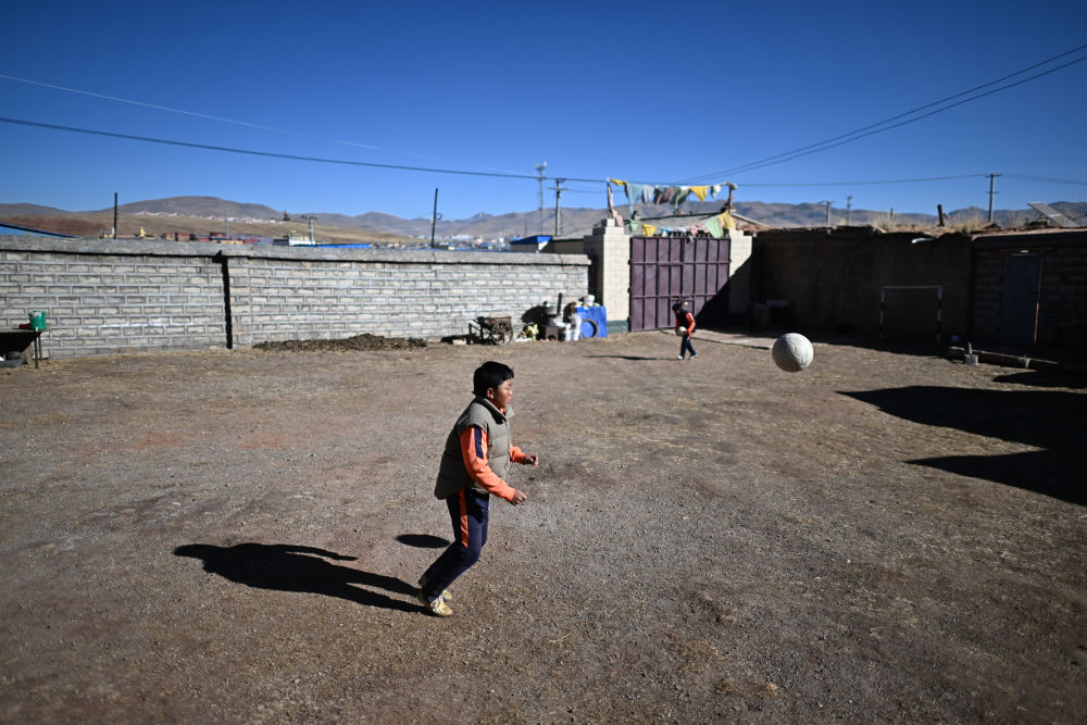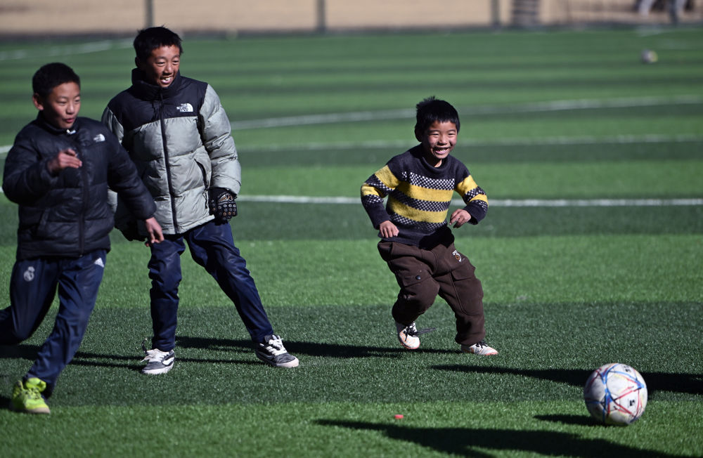 青海玉树曲麻莱县叶格乡寄宿制小学学生卓玛加(右)和伙伴们在球场踢球(1月12日摄)。新华社记者 韩方方 摄