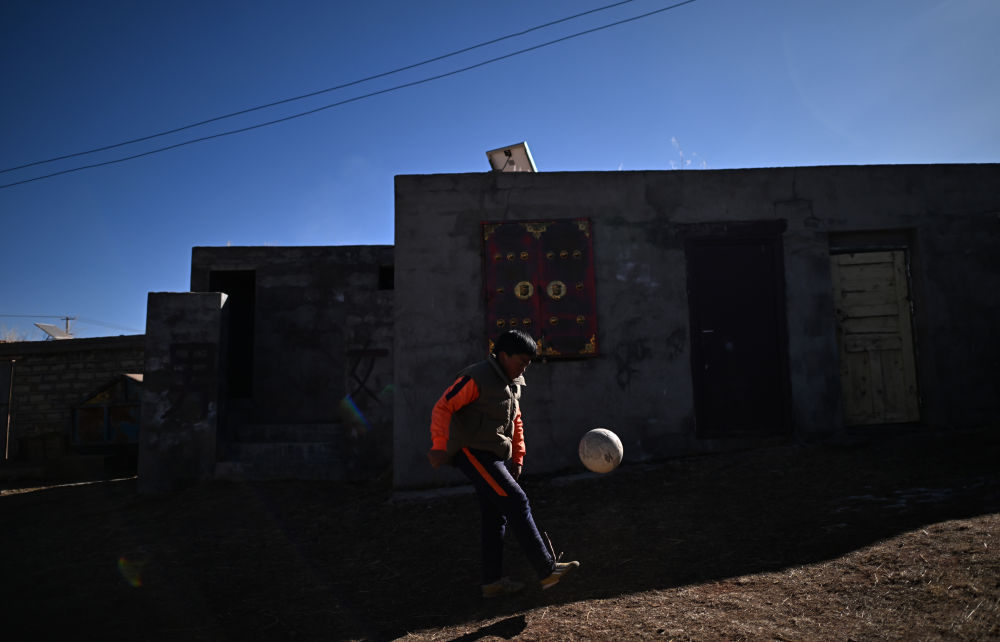青海玉树曲麻莱县约改镇中心寄宿制学校学生悟金唐巧多杰在家中踢球,作为曲麻莱青训队一员,他即将前往广西壮族自治区北海市参加球队冬训(1月12日摄)。新华社记者 张宏祥 摄