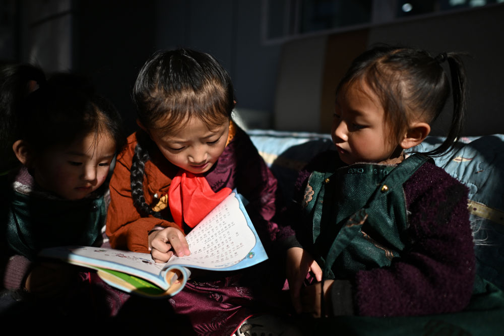 青海玉树曲麻莱县第二民族完全小学学生达沙旦增德金(中)在家中给妹妹讲故事(1月12日摄)。新华社记者 张宏祥 摄