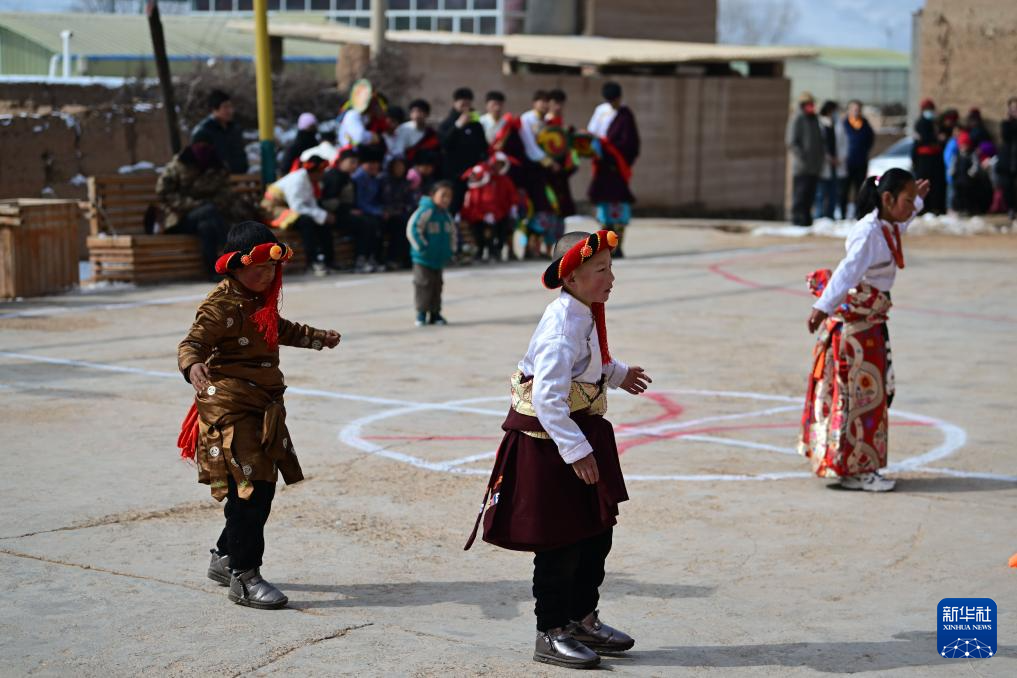 2月7日,孩子们在贺隆堡村迎新春活动现场表演锅庄舞。新华社记者 张龙 摄