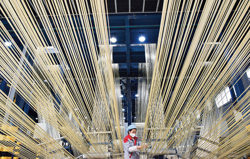 在中复神鹰碳纤维西宁有限公司,工作人员在整理碳纤维原丝(2023年2月22日摄) 吴刚摄/本刊