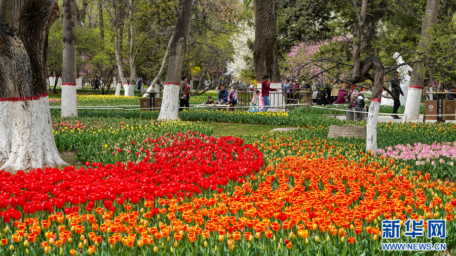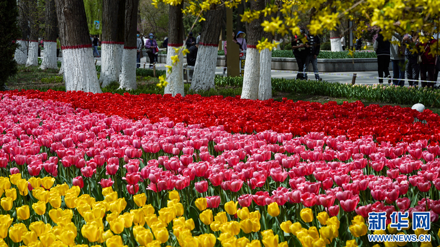 4月19日,在青海省西宁市人民公园,人们在盛开的郁金香旁休闲。新华网发(宋忠勇 摄)
