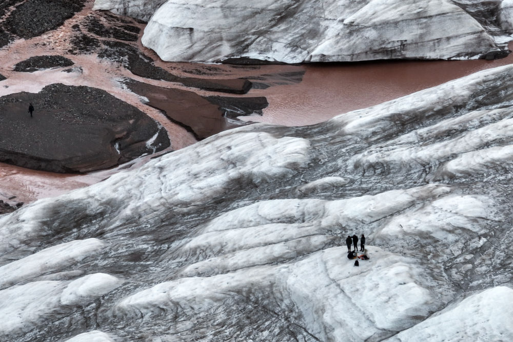 7月25日,在冬克玛底冰川,科考队员在探测冰川(无人机照片)。新华社记者 伍志尊 摄