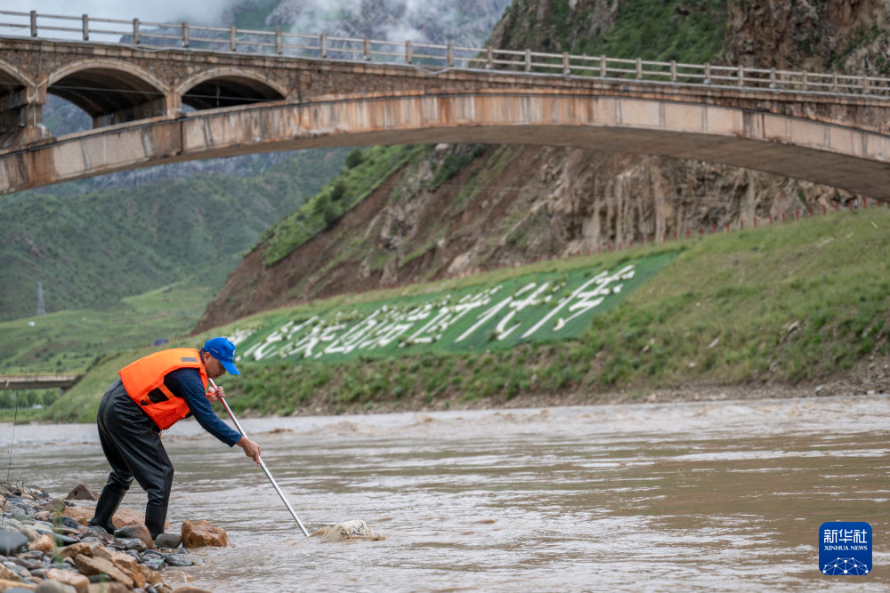 7月21日,在囊谦香达河段,科考队员在进行底栖生物监测采样。新华社记者 伍志尊 摄
