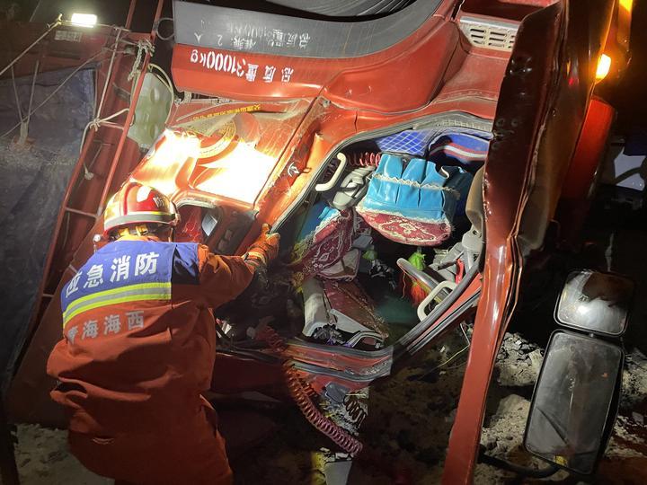 2023年12月26日,茫崖市消防救援大队消防指战员在破拆事故受损车辆。新华社发