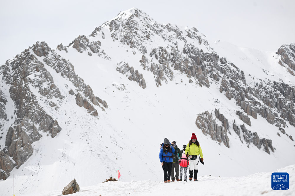当日,在青海省海北藏族自治州门源回族自治县,登山爱好者们攀登岗什卡雪峰,度过新年第一天。