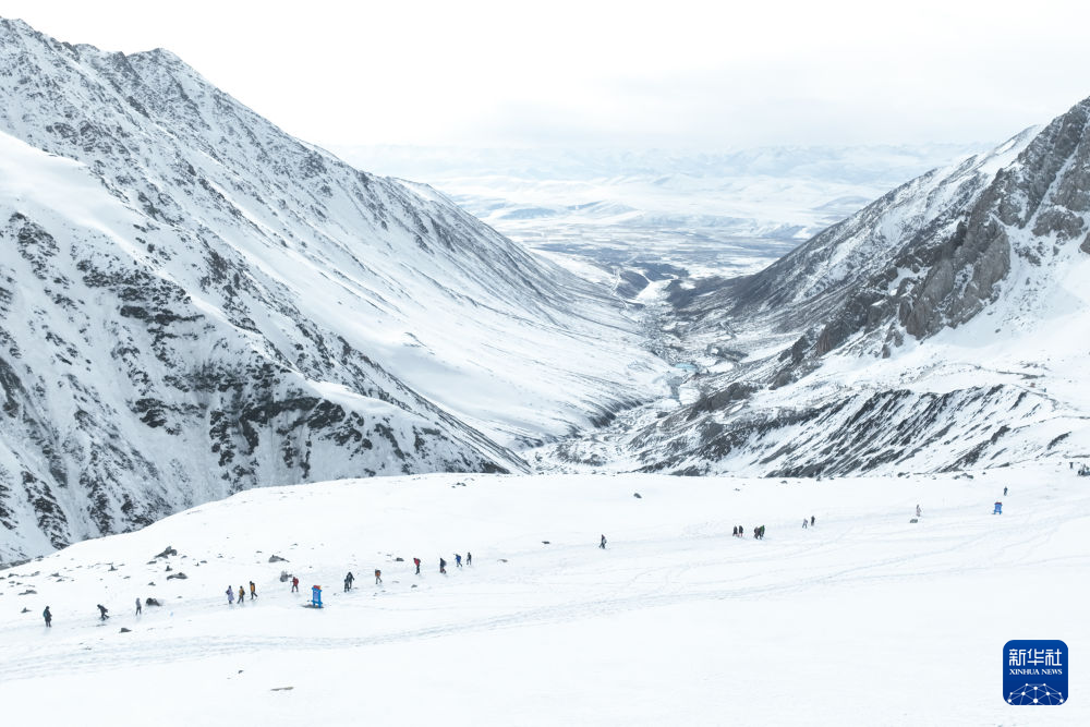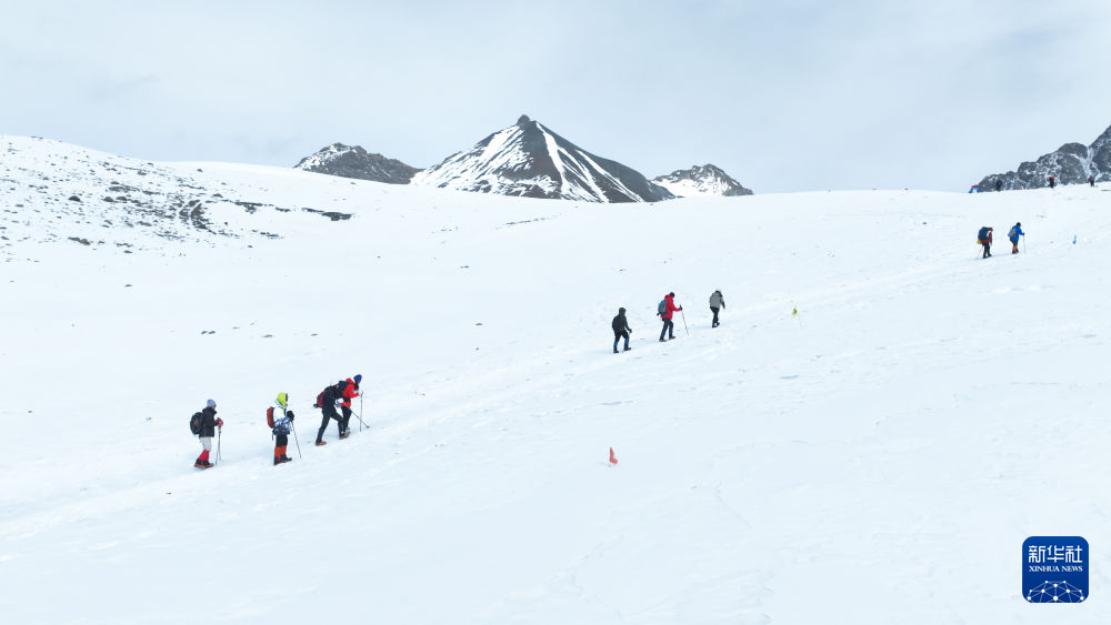 1月1日,登山爱好者在攀登岗什卡雪峰(无人机照片)。新华社记者 张龙 摄