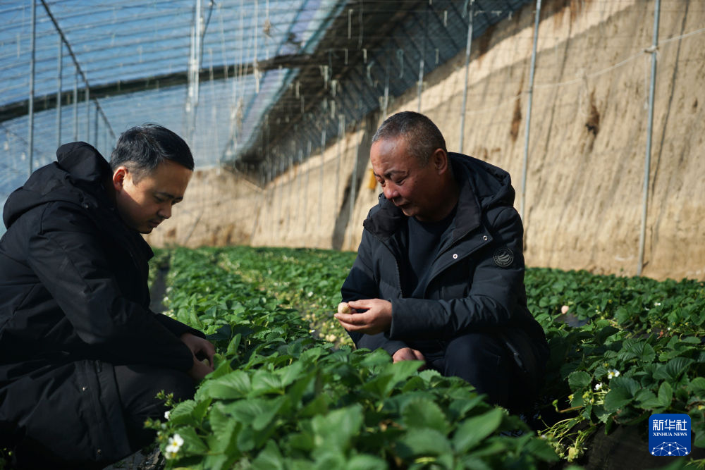 1月17日,张志伟(右)与杨世鹏交流草莓种植情况。新华社记者陈杰 摄