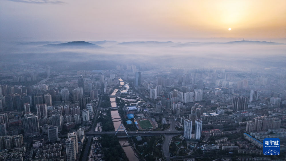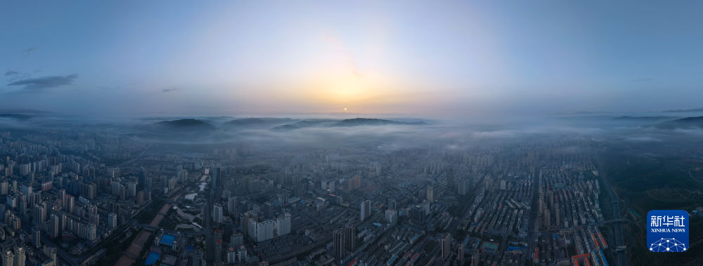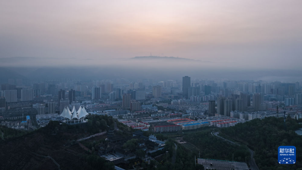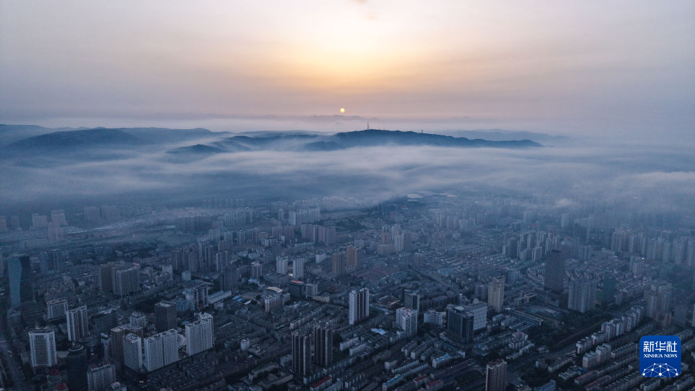 这是5月22日拍摄的青海省西宁市日出景象(无人机全景照片)。新华社记者 齐芷玥 摄