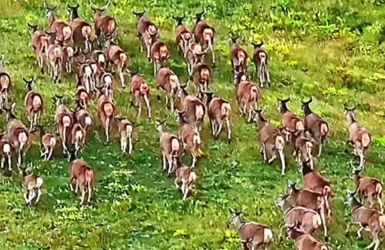 近日,摄影爱好者在青海省玉树藏族自治州囊谦县觉拉乡拍到近百只国家一级保护动物白唇鹿,画面中白唇鹿动作敏捷,沿着山坡漫步、奔跑。秋日的高原天高气爽,远处的雪山连绵巍峨,白唇鹿给高原秋色带来了一抹灵动。