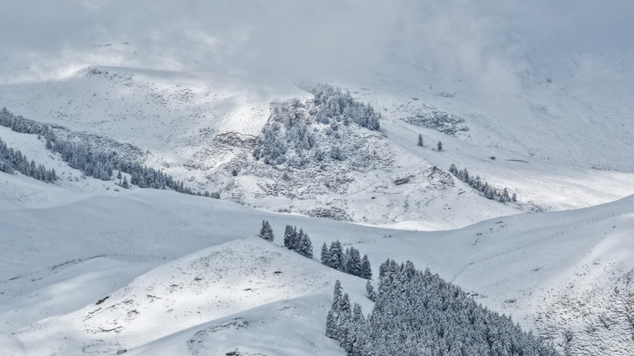 近日,在青海省海北藏族自治州祁连县境内,连绵不绝的祁连山脉被白雪覆盖,大地银装素裹,静谧纯净,尽显壮美山川。