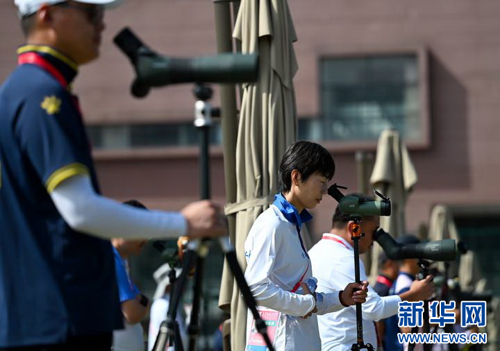 11月15日,青海队教练赵琳丽(左二)在比赛中通过望远镜查看选手成绩。 新华社记者 郝源 摄