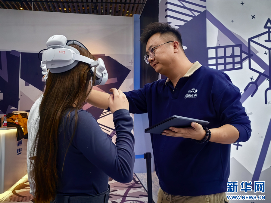 11月20日,市民在“身临极境 南极起航”VR沉浸式大空间体验展活动中佩戴电子设备感受科技的魅力。新华网发