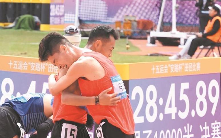 男子10000米比赛结束后运动员拥抱致意。殷之皓 摄