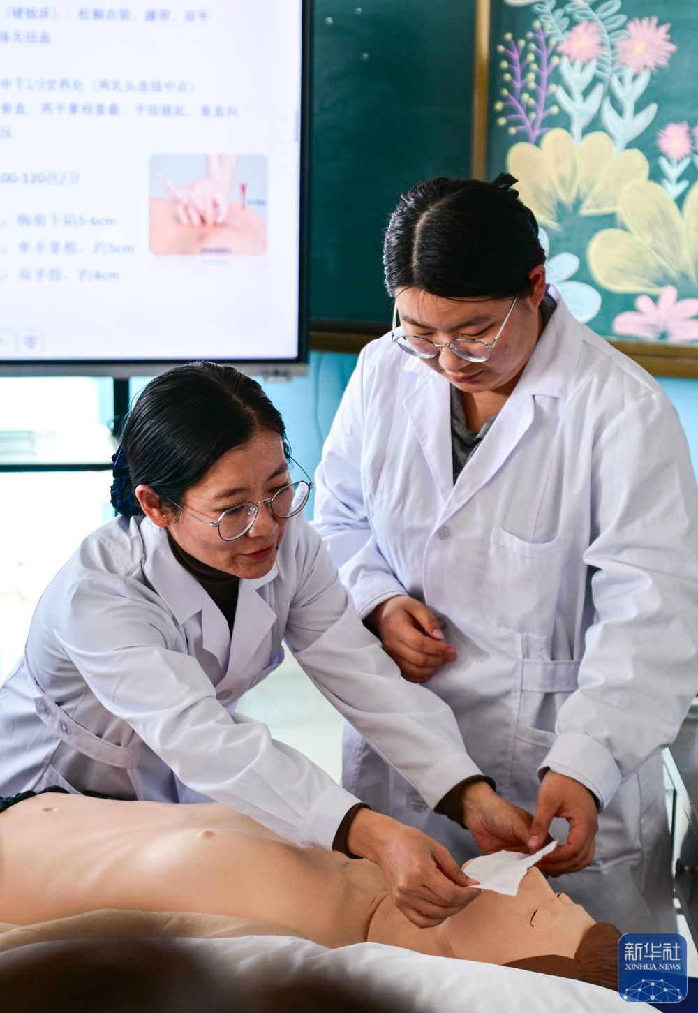 12月23日,在青海省海北藏族自治州职业技术学校,山东援青教师刘芹英在指导护理专业学生。