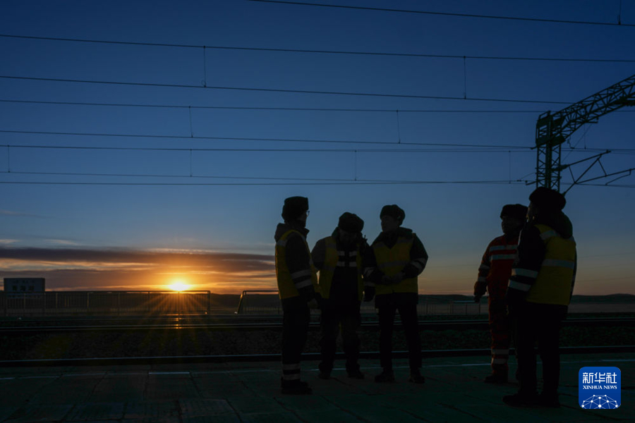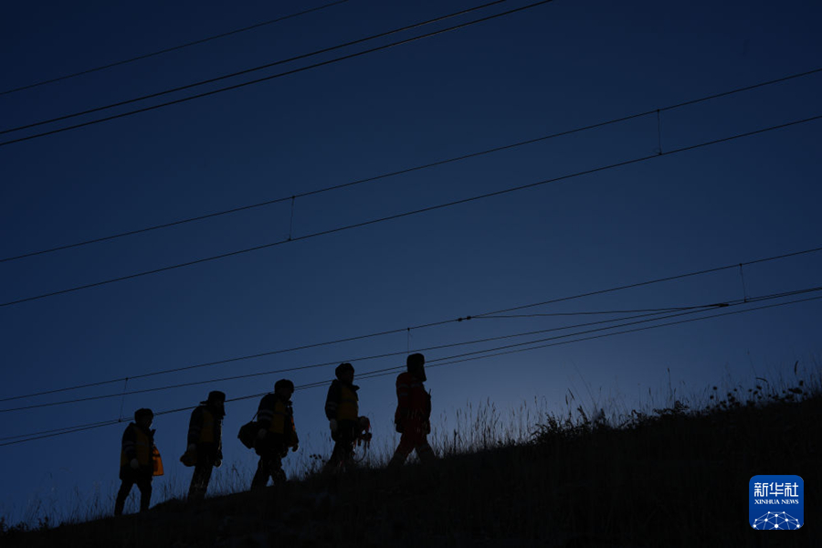 信号工们在哈尔盖信号车间哈尔盖信号工区青海湖站铁轨附近巡检。