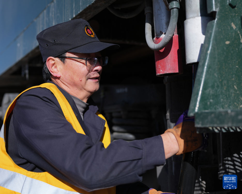 2月4日,韩景泉在放水过程中巡检列车,前面是工区储水井。新华社记者 齐芷玥 摄