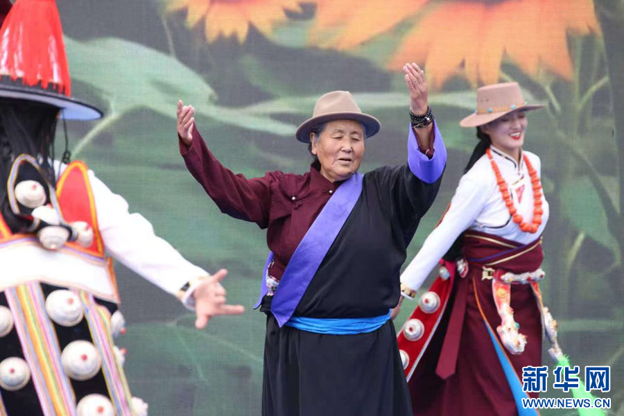 国家级非物质文化传承人拉毛(中)在展示“尚尤则柔”(贵德县委宣传部供图)
